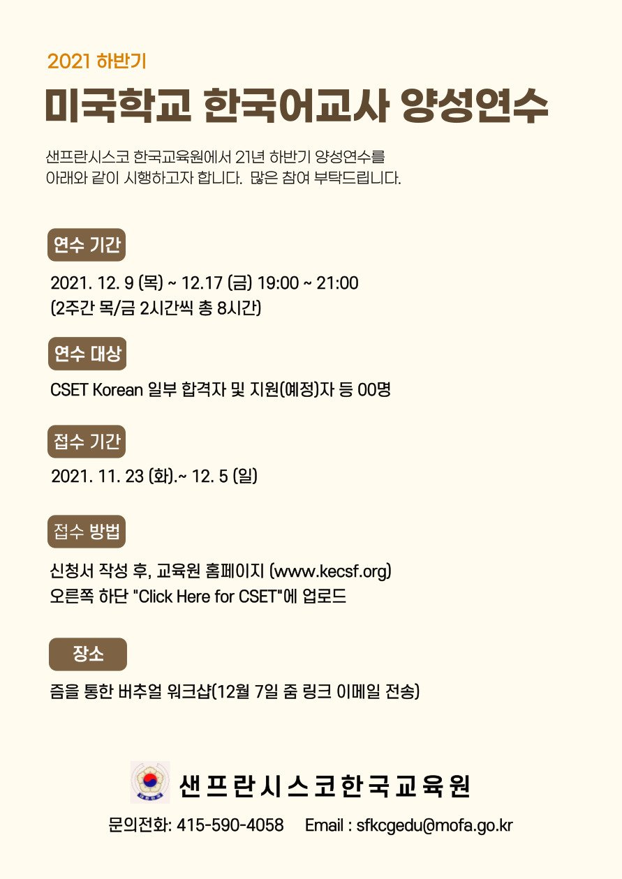 21년 하반기 한국어교사(CSET) 양성연수 신청자를 모집합니다.