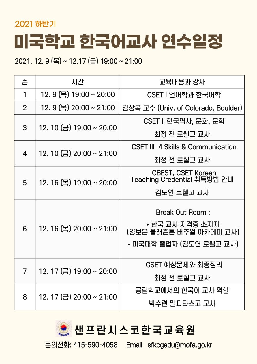 ◦ 연수 기간 및 시간 : 2021. 12. 9(목) ~ 12. 17.(금) 19:00 ~ 21:00 (2주 목금 2시간씩 총 8시간)