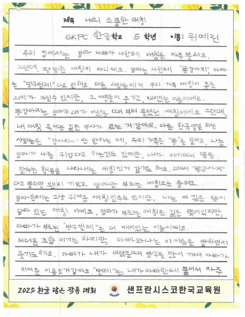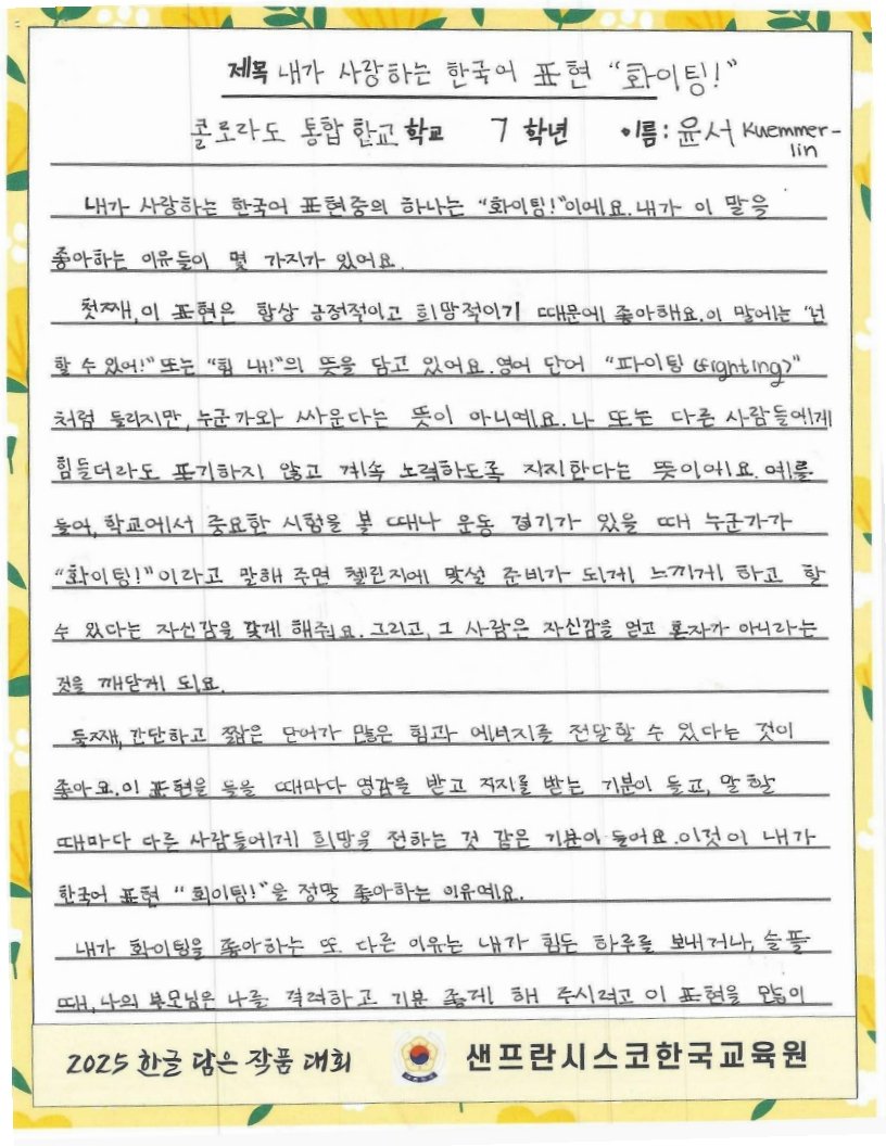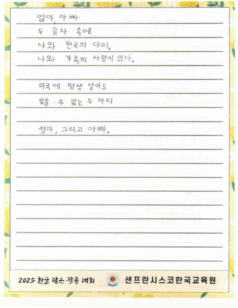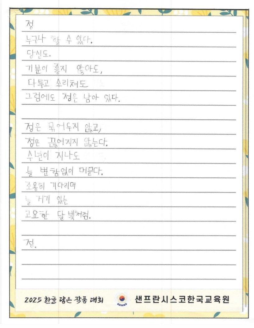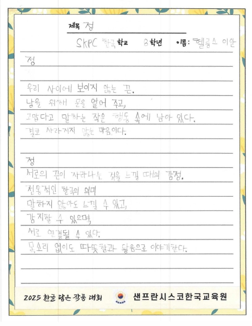 We hope to spread the beauty of Hangeul and Korean culture through the Hangeul Art Contest, for both weekend Korean schools and elementary school students by selecting artworks that express their love for Hangeul.