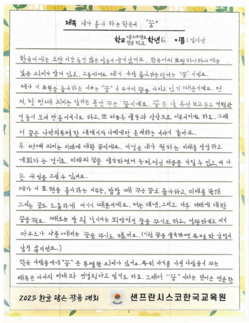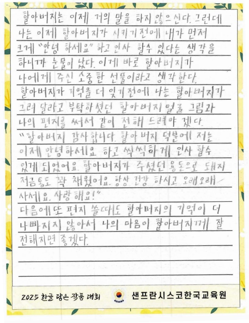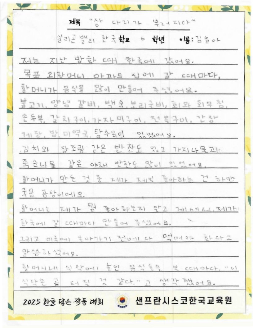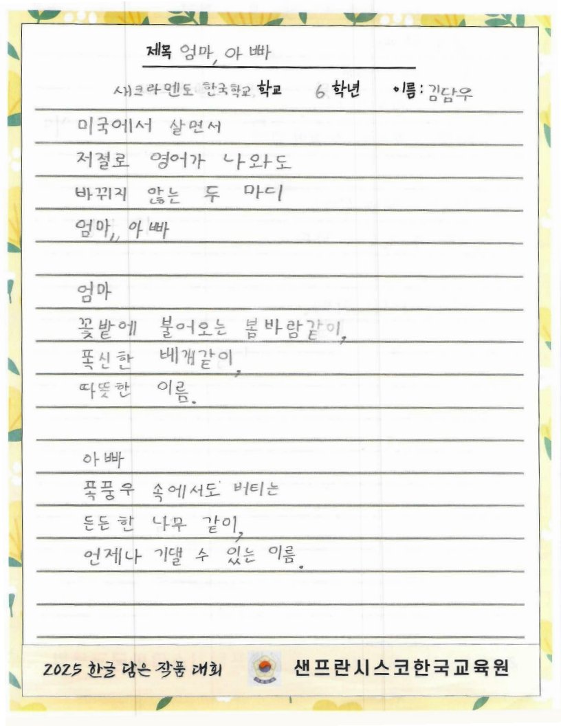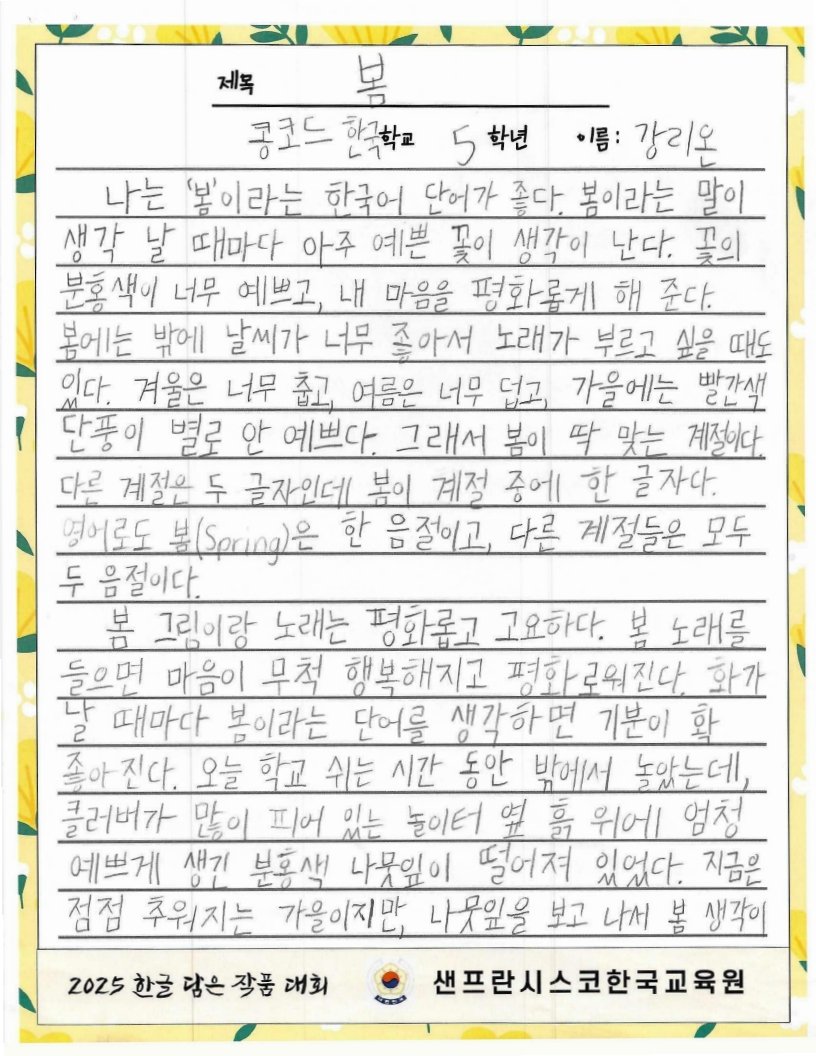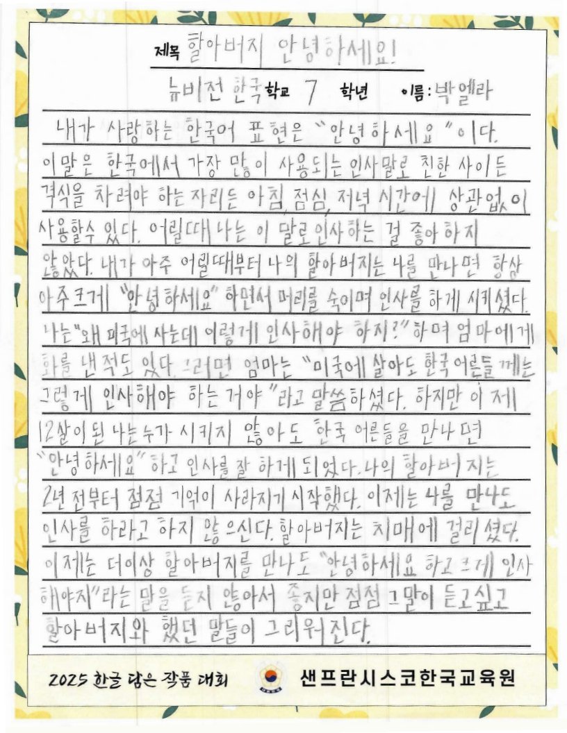 We hope to spread the beauty of Hangeul and Korean culture through the Hangeul Art Contest, for both weekend Korean schools and elementary school students by selecting artworks that express their love for Hangeul.